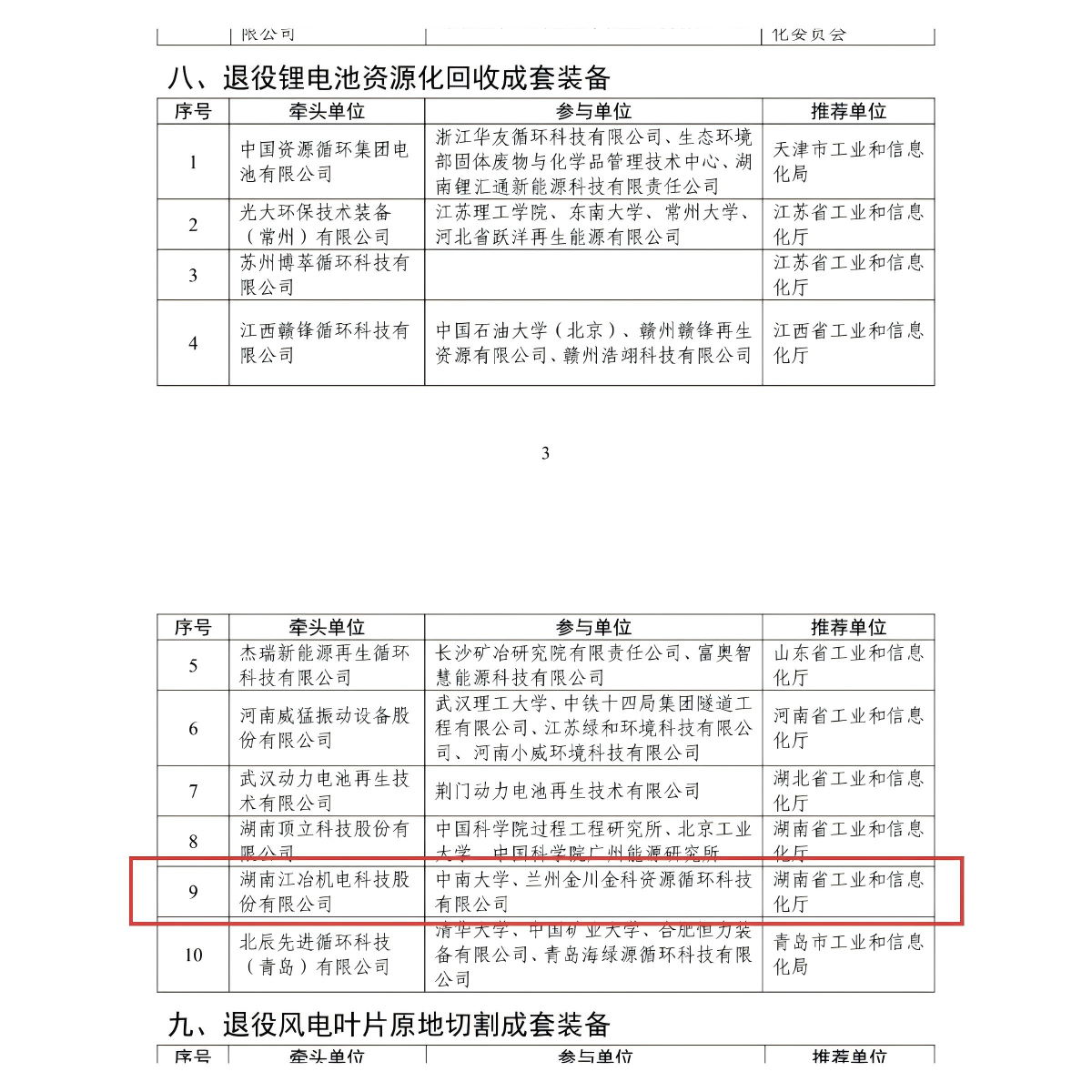 近日,工业和信息化部公布《2025年重大环保技术装备创新任务揭榜挂帅入围单位名单》,经自主申报、省级推荐及专家评审,湖南江冶机电科技股份有限公司(以下简称“江冶机电”)凭借深厚技术积淀、成熟产业基础及突出创新能力,成功入围“退役锂电池资源化回收成套装备”任务榜单,并作为牵头单位,联合科研机构及产业链上下游企业,协同推进该国家重大创新任务攻关,助力新能源产业绿色循环发展。